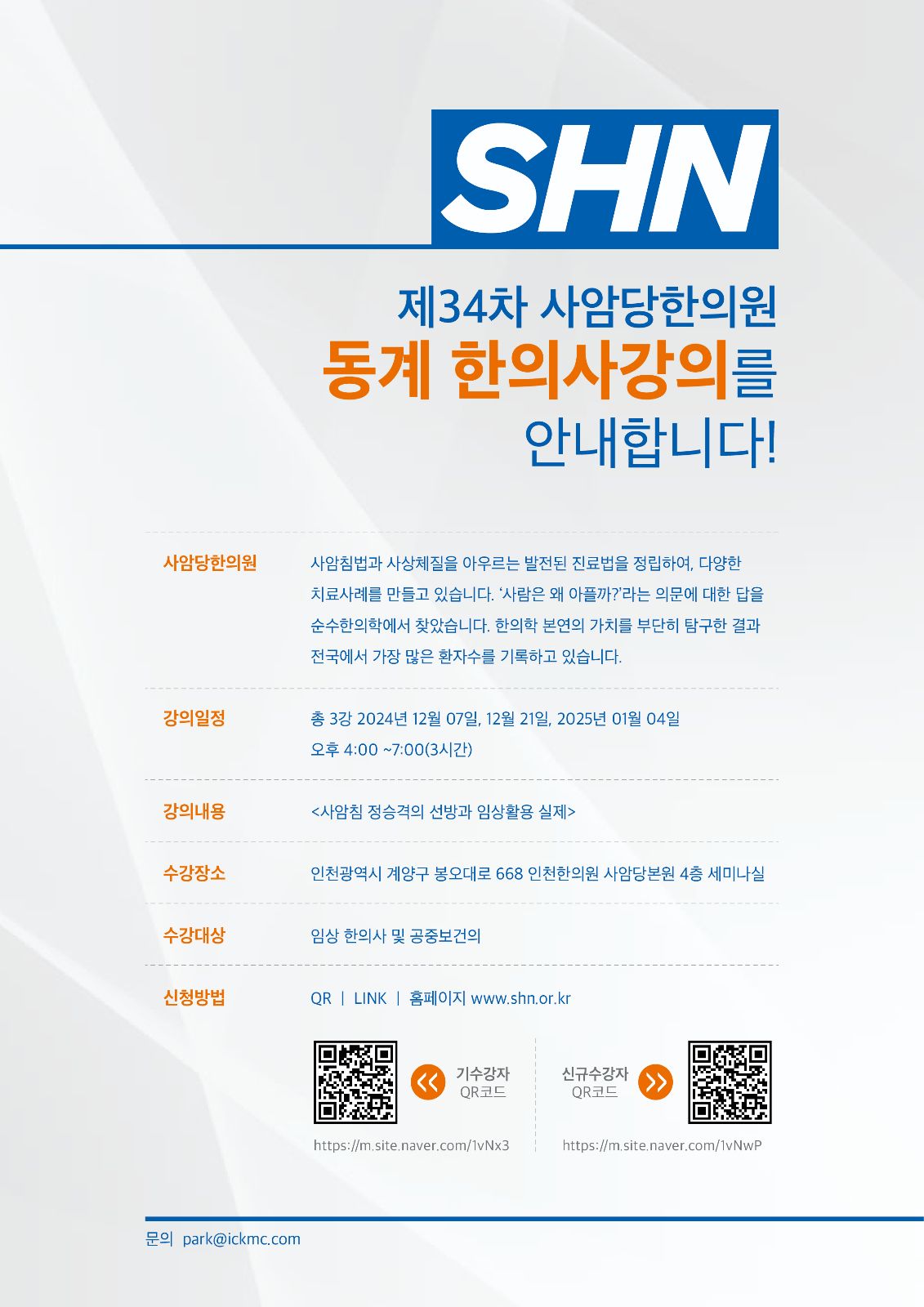SHN 제 34회 한의사 학기강의 안내합니다.